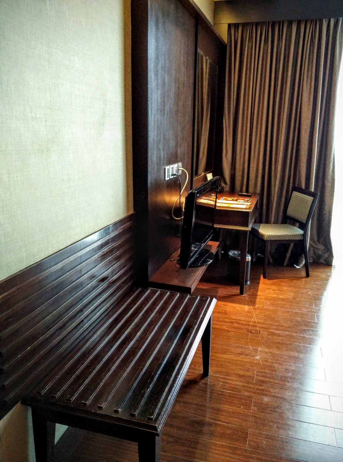 The hotel rooms are spacious compared to the ones in land scarce Singapore and offers plenty of room to move around. The design of the hotel is business like and uses plenty of wood elements. A small study table and another small coffee table if offered in the room. A wooden bench seats in the middle of the room which is useful for placing your luggage.